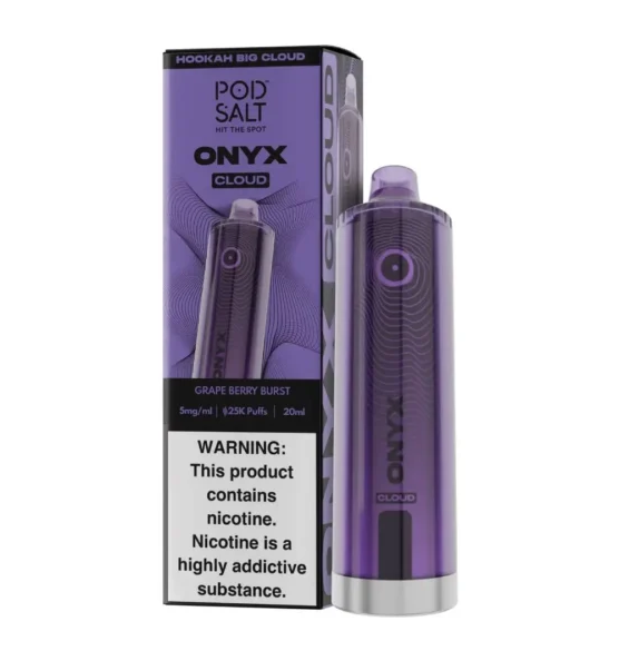 POD SALT Onyx Cloud Grape Berry Burst 25000pfs 5mg offers a smooth, long-lasting vape with 25000 puffs and 5mg/ml nicotine.Its sleek, portable design makes it perfect for on-the-go use. Enjoy a satisfying, consistent vape experience with every puff, wherever you are.