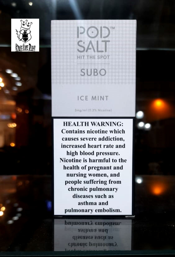 A refreshing Pod Salt Subo Iced Mint flavored nicotine salt e-liquid made for a glacial vaping experience.