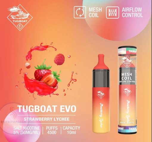 Tugboat Evo Strawberry Lychee PUFFS 4500- smooth overtones are accompanied by a Strawberry Lychee blast to refresh the senses and chill the throat